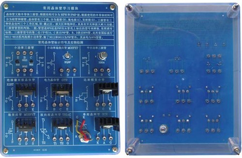 底盒使用190mm×145mm的開模有機透明塑料底盒,模塊面板采用印制電路板PCB工藝,可以直觀看到器件的實物及相關的原理介紹。對于典型應用及易損器件安裝在面板背面,透過透明底盒能夠看到器件實物,方便感性認識、檢測測試,同時也能防止器件的損傷。