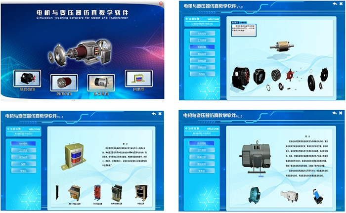 電機與變壓器仿真教學軟件依據《職業院校數字校園建設規范》(教職成函[2015]1 號)與教育部頒布的有關專業教學大綱而設計,選取典型的電機與變壓器,圍繞其核心知識點和技能點展開,兼顧教師的課堂教學,力爭達到軟件的職業性、情境性、過程性、交互性的相互交融。