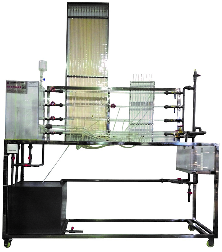移動式不銹鋼實驗臺、儲水箱;雷諾測試管;伯努利測試管;沿程阻力系數測試管;突擴、突縮測試管;閥門局部阻力系數測試管;孔板流量計測試管;文丘里流量計測試管;和皮托管測試管;測壓板直接顯示總水頭線和測壓管水頭線;壓力傳感器24套、流量傳感器4套、溫度傳感器1套、觸摸屏、測壓板。