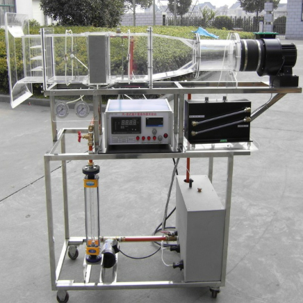 循環防腐水泵,轉子流量計,翅片管式換熱器,風洞實驗段,離心式風機,自動調節風門,笛形管及差壓測風速裝置,加熱由固體調壓模塊無級調節,控制測試儀表箱,不銹鋼加熱水箱,巡檢儀顯示溫度、水和風的阻力及風速,不銹鋼臺架及控制屏。