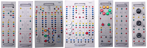 提供中間繼電器(線圈電壓220V)二只,熱繼電器一只,熔斷器三只,轉(zhuǎn)換開關(guān)三只,按鈕一只,行程開關(guān)四只,信號燈、保險絲座各一只。各器件的工作端子均已引到面板上,供實驗接線用,中間繼電器及熱繼電器的工作狀態(tài)用發(fā)光二極管指示。