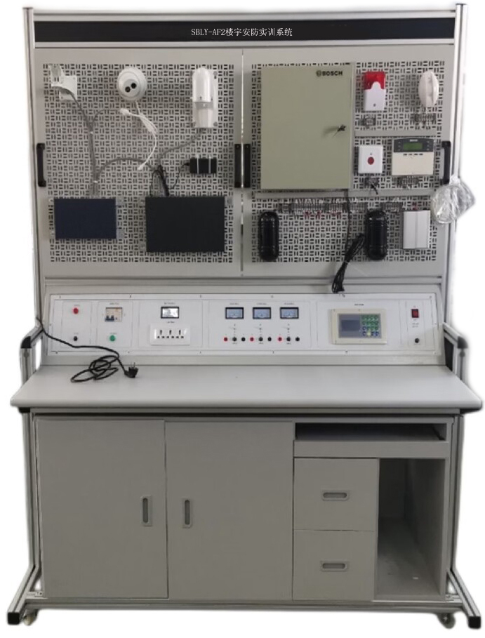 樓宇安防實訓系統采用開放式和拆裝式結構設計,采用鋁合金型材+網孔板結構,桌面為高級防火防水板,耐磨高密度板,結構堅固,配有常用電源控制柜,能對各系統進行供電、接線、調試運行和維護實訓和考核。設備有設備備柜,用于放置工具、存放資料等,實訓桌還設有四個萬向輪和四個固定調節機構,便于移運和固定,有利于實訓室布局。本系統全部元器件均采用實物,整個實訓裝置主要由幕簾探測器、紅外探測器、報警主機、門磁、緊急按鈕、聲光報警器、感煙探測器、智能考核器、然氣探測器、警號、Modem、光束對射控制測器、擴展模塊系統等組成。