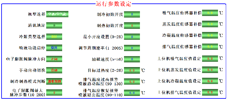 5. 動畫模式:觸摸屏或軟件連接模式下:可顯示壓縮機排氣溫度、吸氣溫度、冷凝溫度、蒸發溫度,可根據溫度實時調節機組過冷度。過熱度。