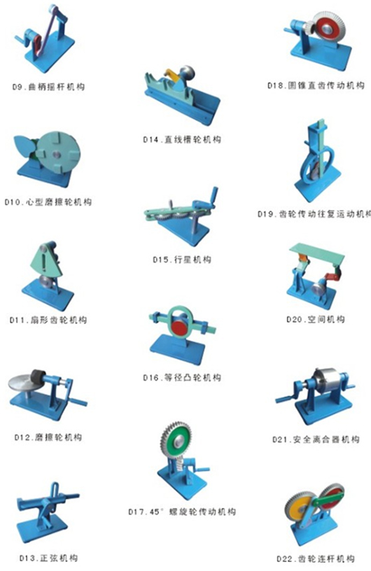2.機械運動簡圖的測繪及分析實驗模型系列產品分為JCF-A型(測繪及分析實驗模型基礎型)、JCF-B型(測繪及分析實驗模型基礎型)、JCF-C型(創新型測繪及分析實驗模型)和JCF-D型測繪及分析實驗模型(綜選型),每大類型中精選配置典型的機構模型。