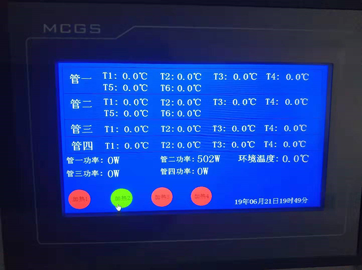 配有四根不同長度和直徑的電鍍紫銅管,管內設置電加熱器;每根管子的表面裝4~6支測溫傳感器,以測定其表面平均溫度,測溫傳感器采用進口DS18B20;每根橫管電加熱器配備電子集成固體調壓模塊無機調節(jié)。測試儀表箱設有(每根橫管電加熱器)數(shù)顯功率表;所有測試數(shù)據由7寸觸摸屏同屏顯示,不銹鋼實驗支架。