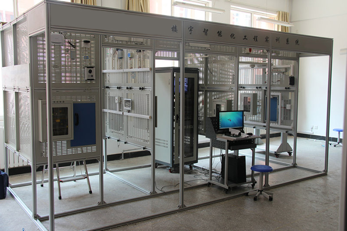 采用歐標40X40工業鋁型材框架,四周墻體采用1.5mm厚安裝布線網孔板組成(網孔布局為5X15mm,配工業標準塑制安裝孔件),4600mm×2300mm×2400mm(長×寬×高),實訓平臺分為管理中心、智能小區、智能大樓和樓道等區域。